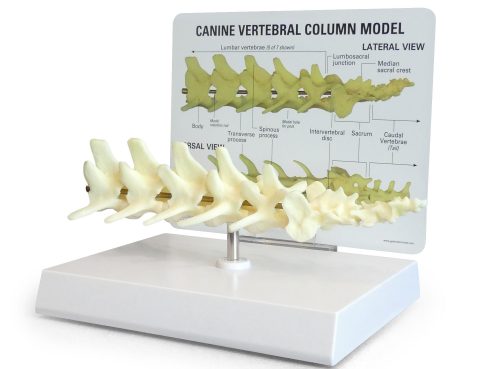 Canine vertebral column model of average size features five lumbar vertebrae and discs, caudal (tail) vertebrae and sacrum.