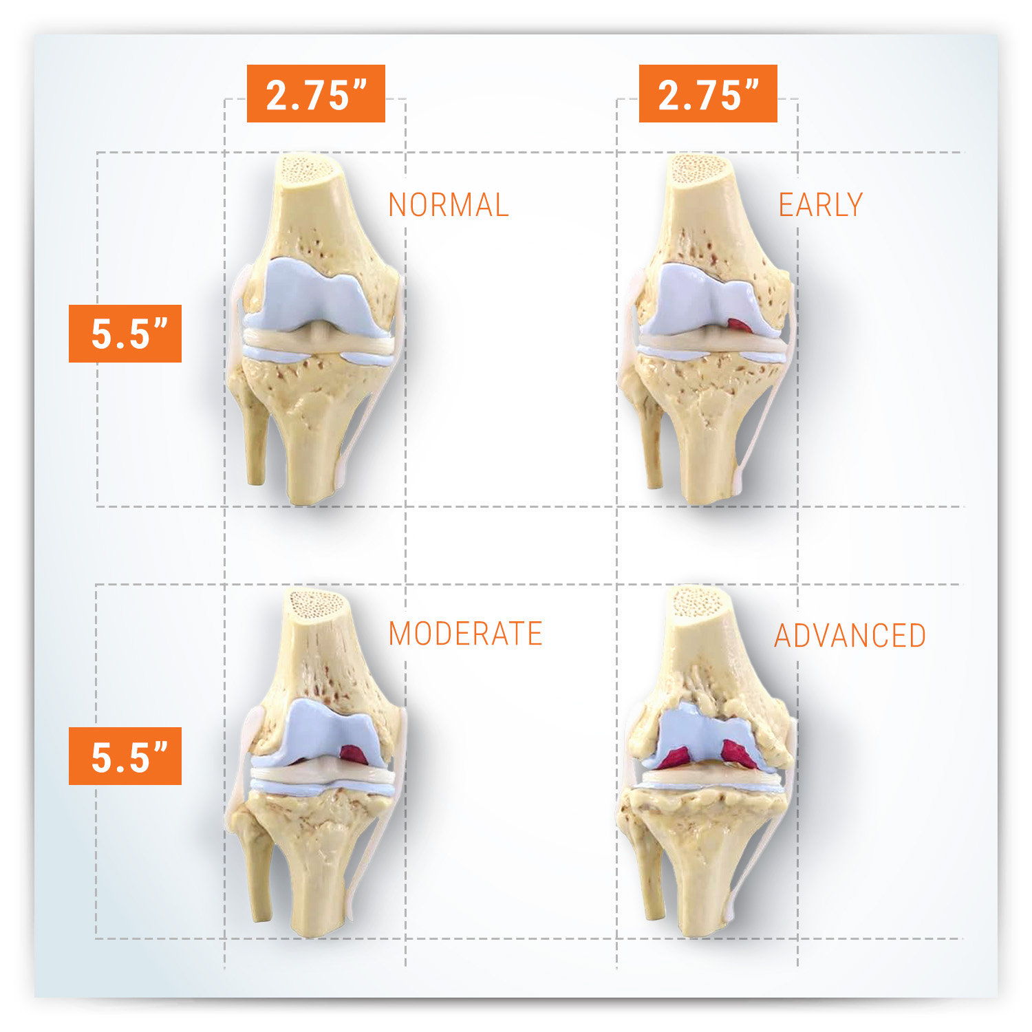 Set of four knee models, reduced size, illustrating: degenerative joint disease (osteoarthritis); erosion to joint articular cartilage; progression of degenerative joint disease; osteophytes (bone spurs) at the articular surfaces. Advanced stage knee is articulating for additional view of joint.