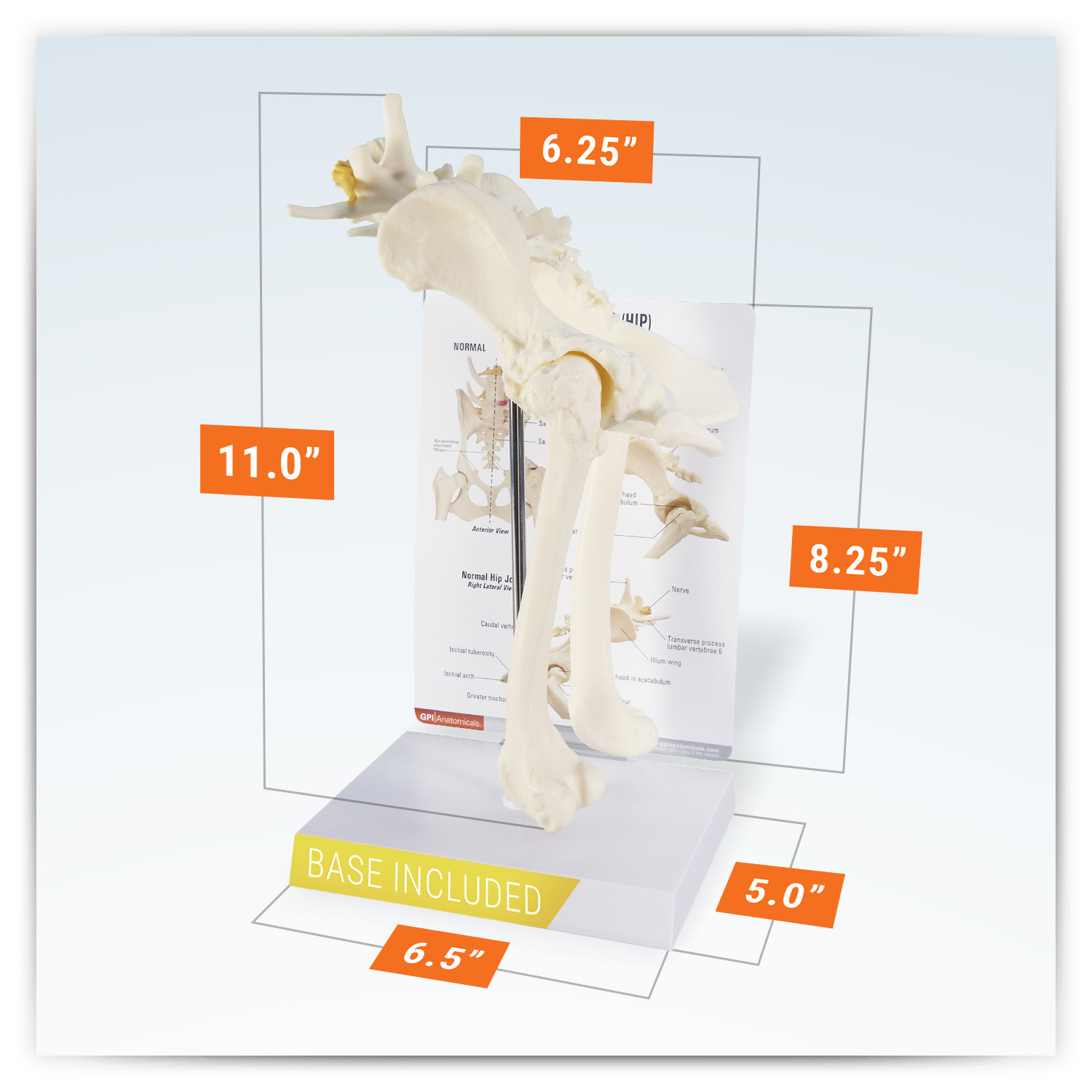 Canine pelvis model of average size features both normal and osteoarthritic bone, body of ilium, greater trochanter, head in acetabulum, herniated disc, neck of femur, nerve, sacrum, and third trochanter.