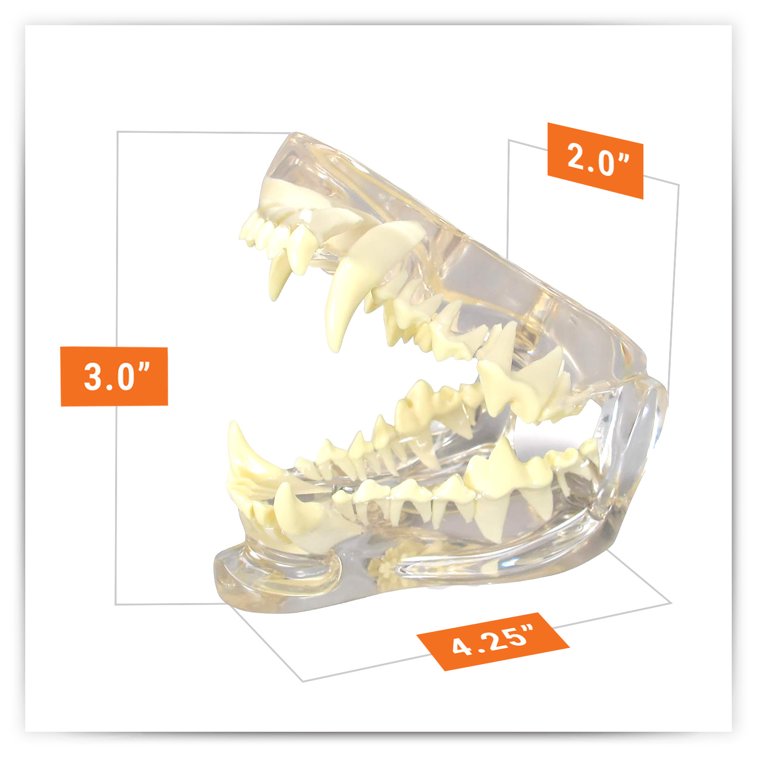 Clear hinged canine jaw model showing the roots of all teeth (incisors, canine, premolars, molars). Jaws open, close and separate for closer study.