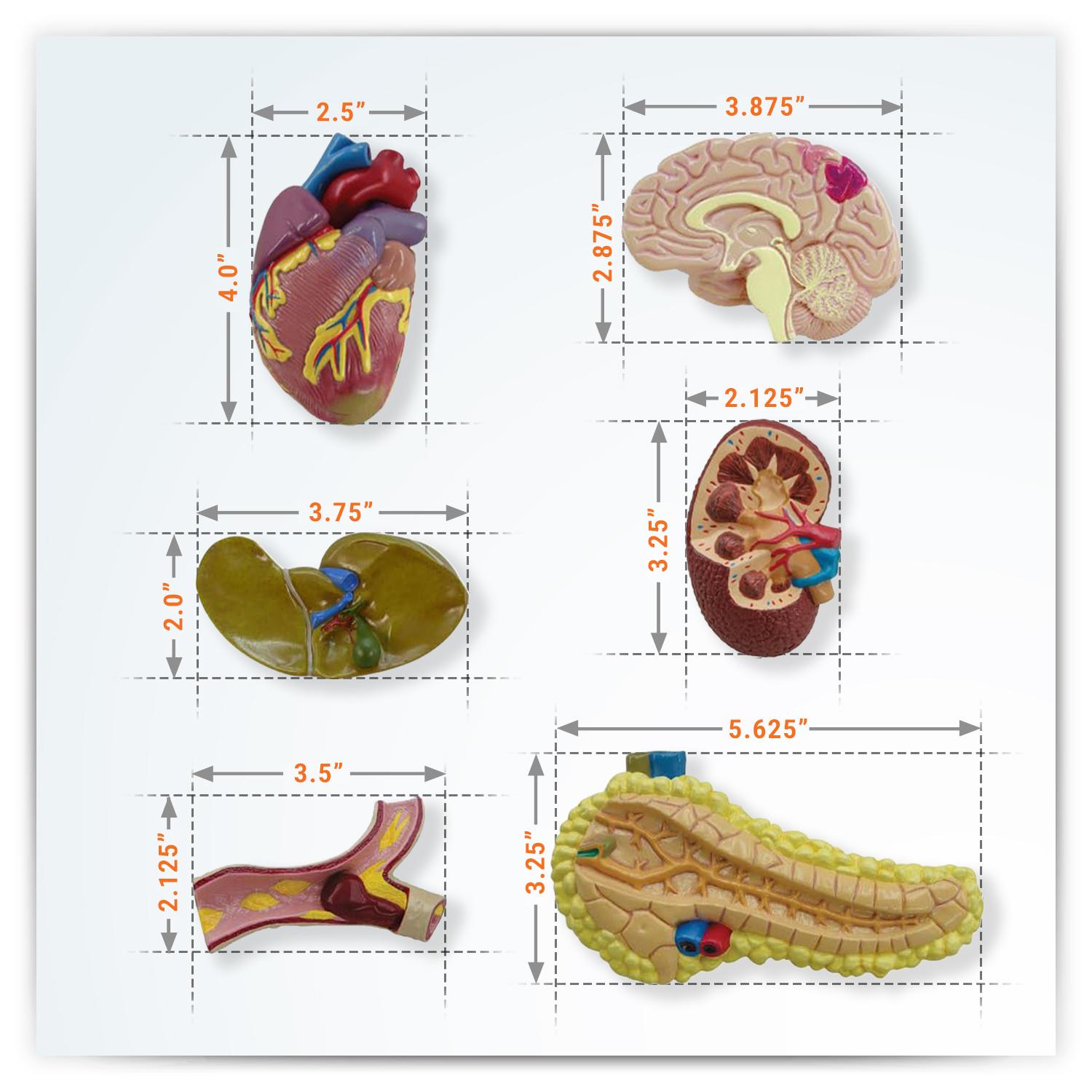 Metabolic syndrome model includes miniature brain, heart, kidney, liver, artery, pancreas. Education card illustrates effects associated with Metabolic Syndrome: stroke, congestive heart failure, coronary artery disease, angina, myocardial infarction, no-alcoholic fatty liver disease, artherosclerosis, renal arteriosclerosis, nephrosclerosis.