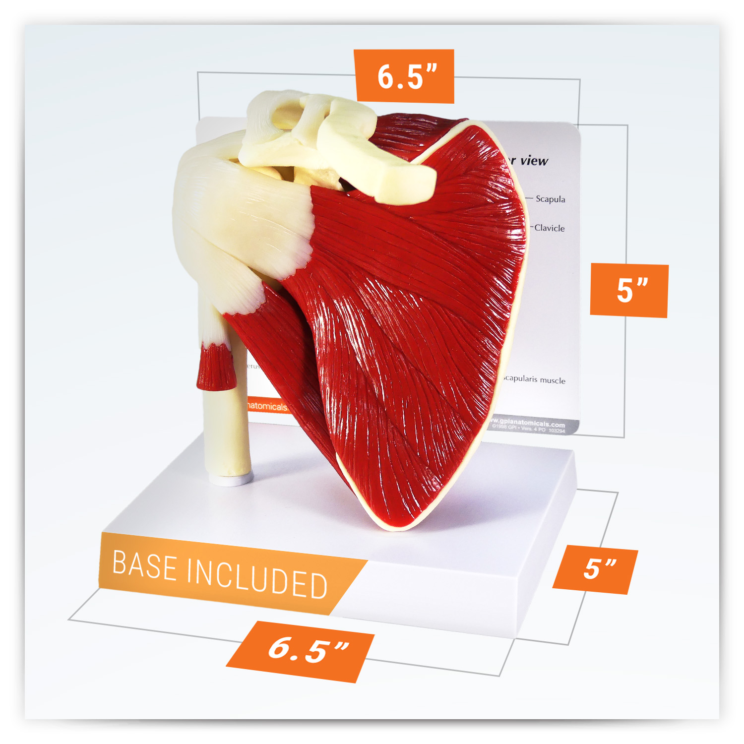 Full size normal right shoulder includes: infraspinatus, subscapularis, supraspinatus, and teres major and minor muscles; acromion, clavicle, humerus and scapula bones; plus eight ligaments and tendons.