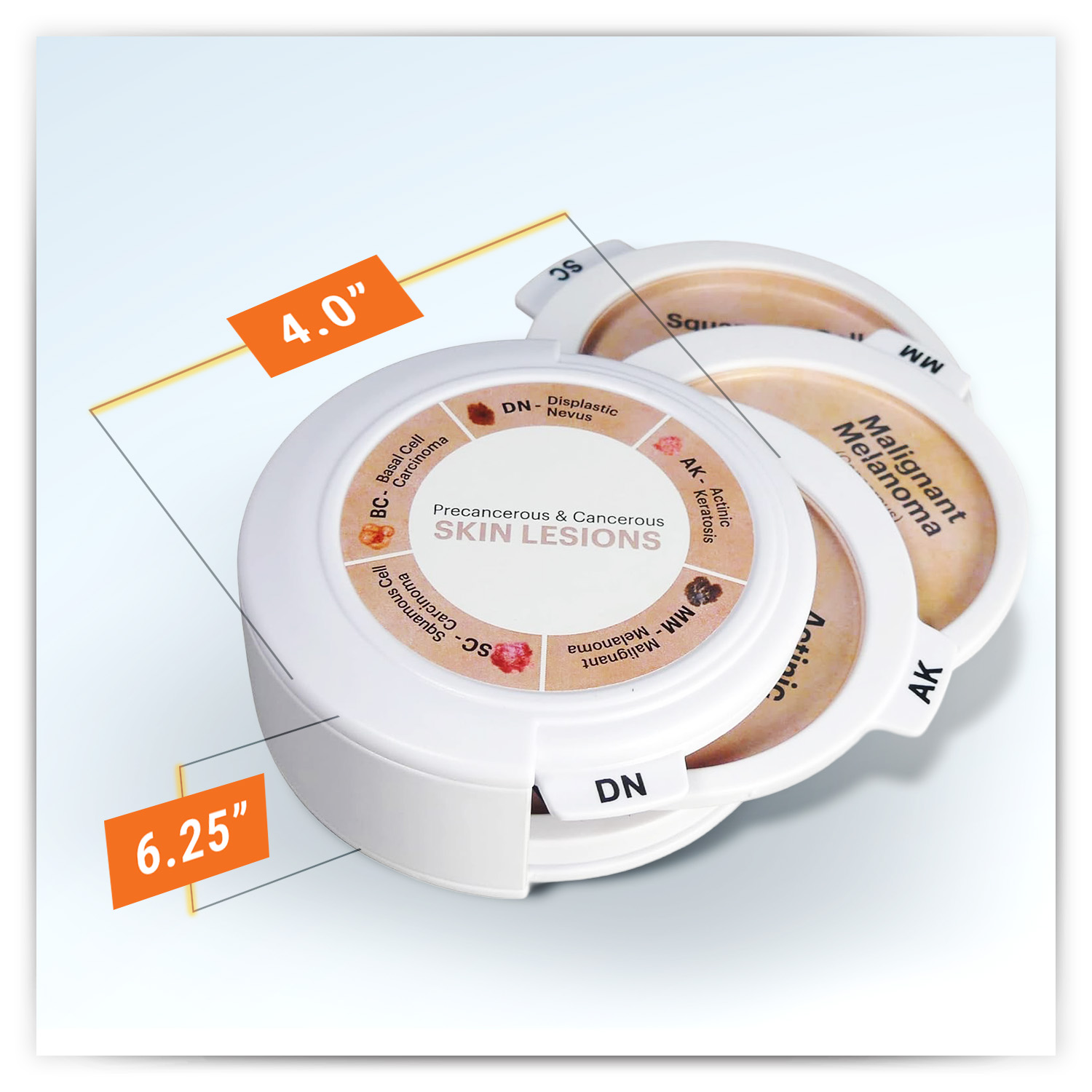 Model presents full size and enlarged views of dysplastic nevus, actinic keratosis, malignant melanoma, squamous cell carcinoma, and basal cell carcinoma skin lesions. Each disk has a 3-dimensional surface to help demonstrate the skin condition. Back side of disk presents additional lesion information.