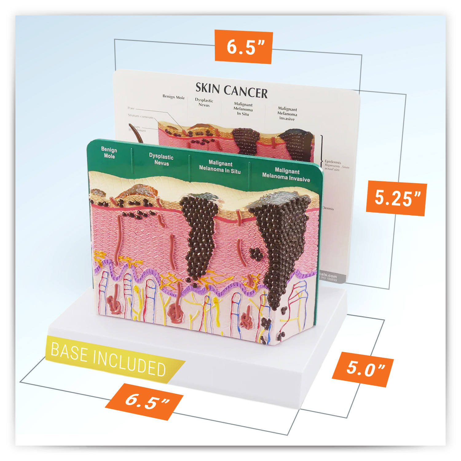 Enlarged two-sided skin cross-section. This skin cancer model displays dysplastic nevus, actinic keratosis, malignant melanoma, squamous cell carcinoma, and basal cell carcinoma skin lesions.